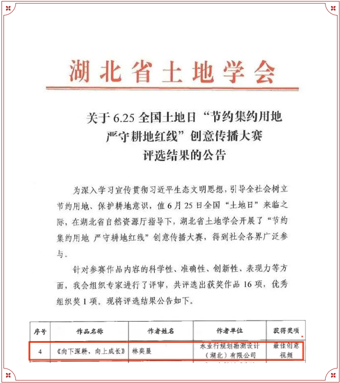 近日,2025年湖北省土地学会6.25全国土地日“节约集约用地,严守耕地红线”创意传播大赛获奖名单揭晓,永业行参赛永业行《向下深耕,向上成长》获评“最佳创意视频”。