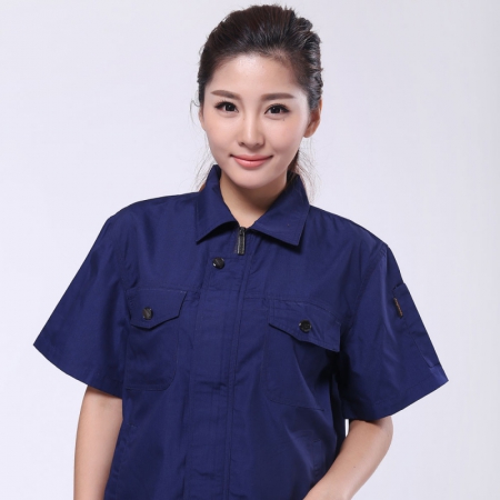 苏州鹰诺服装:深蓝配桔红短袖工作服AD069