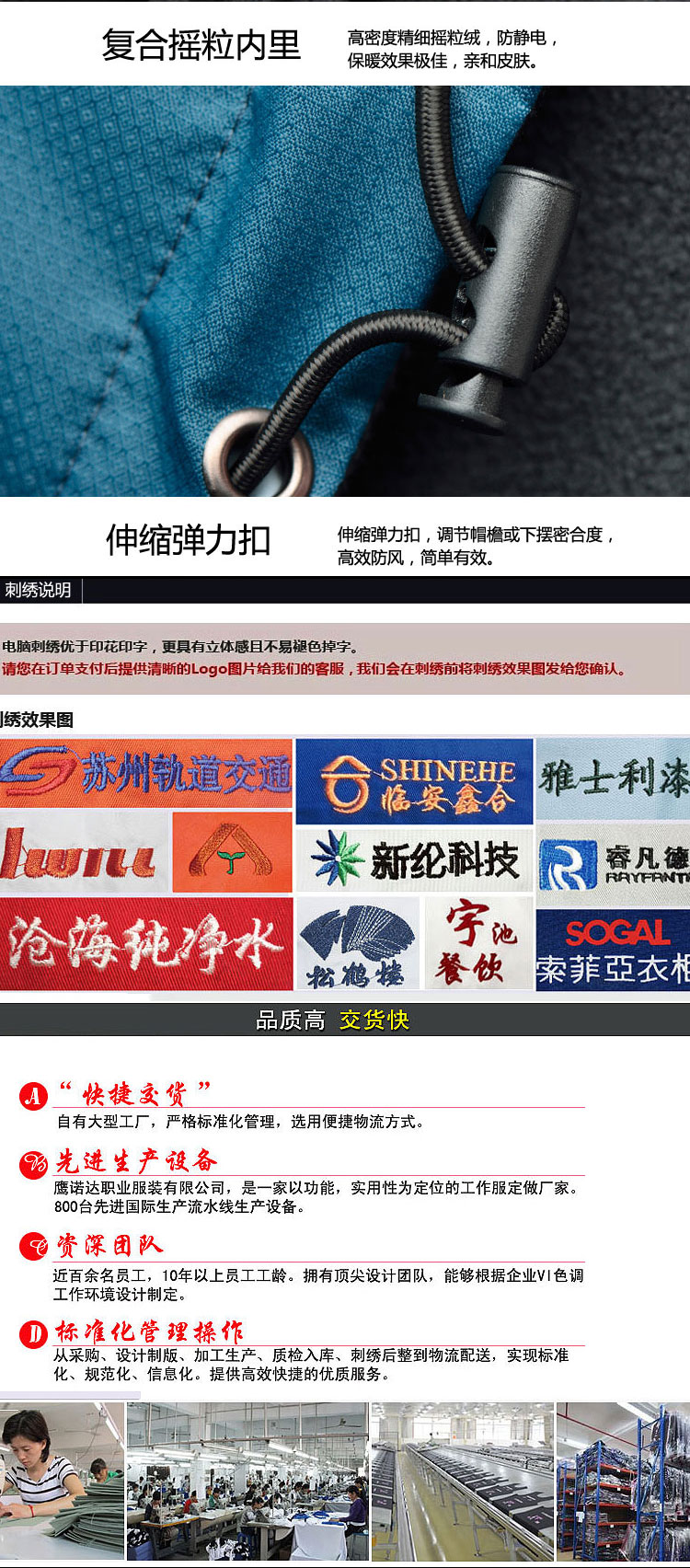 正是坚守着这种信念,历经16年的发展,由最初的10多人的起家的小企业,发展到今天拥有企业盐城骏放服饰,苏州鹰吉派劳保,苏州凯宏劳保下属3家企业,员工人数5000余人的大型企业,2001年按国际惯例组建了三大中心,生产中心以白大褂为龙头,推动其它产品,如t恤,西服,冲锋衣,安全帽等,营销中心从事产品开发和市场销售,目前遍及全国的营销网络已经形成。售后中心以帮助顾客解决问题的原则,7*24小时服务!